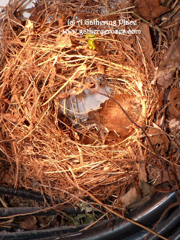 Last month, near the end of June, I shared with you all about the tiny Wren who made a nest for her babies in a garden hose hanging on the wall in my hubby's workshop. Remember? Not wanting to get too close, I had a hard time seeing inside the nest, but I was pretty sure two or three tiny eggs were tucked safely inside...